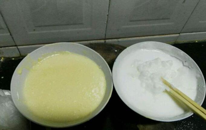 第3步,将打发的奶油状蛋清,均分三次加入蛋黄面糊中,每次加入后用搅拌器上下翻搅,注意一定不能画圈一样的横向搅拌。