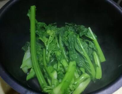 3、芥菜叶放入锅中烫一下,断生,烫到菜叶转青即可取出放入准备好的带盖的锅中。