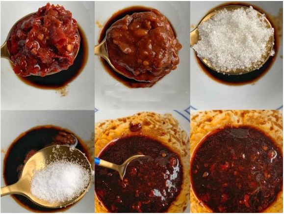 1. 先调一个酱汁,碗中加生抽、老抽、蚝油、豆瓣酱、黄豆酱、糖、盐拌匀备用。