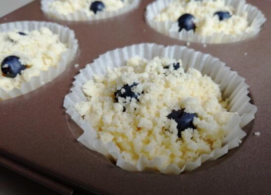 9、再挤入蛋糕糊,挤到八分满即可。在表面放上3粒蓝莓,再撒上酥粒。
