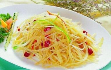 炒制土豆丝要保持锅中有适量的水分,这样炒出的土豆丝不会变软更不会粘锅,利用大火和快速翻炒让其迅速成熟,所以在炒制初期就要放醋了。