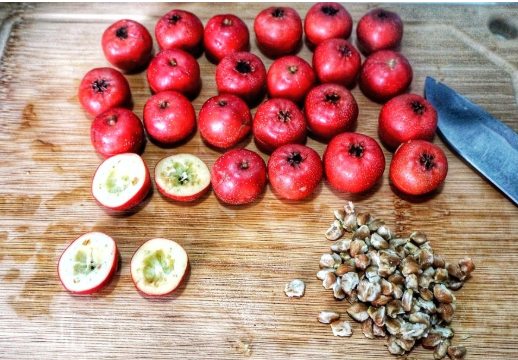 2.去柄,刀横切两半,一扭就能打开,将山楂籽去掉,再重新对接成一个完整的山楂样子