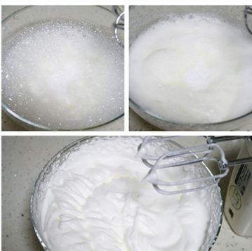 4、接着开始打发蛋白,用柠檬汁或者白醋都可以,倒入几滴在打蛋盆里,用电动打蛋器选择高速档先打发到密集大气泡状,这时候倒入20克的代糖继续打发;打发到蛋白凝固,出现纹路状再倒入20克代糖;等打发到蛋白色泽更白,纹路清晰就放入最后20克的代糖,直到硬性发泡状态,当关闭打蛋器,出现短小的弯钩状态就是可以了。