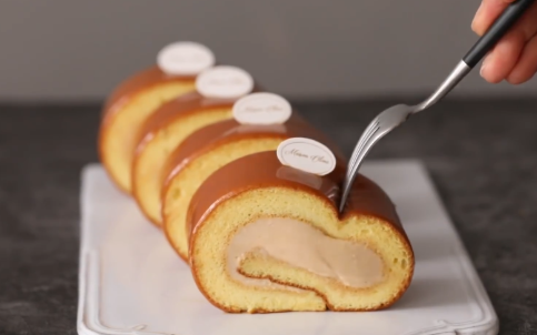 而蛋糕卷外面,淋了一层咸奶油焦糖液,焦糖色泽不仅让人食欲大开,也为其增添不少颜值!