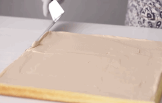 蛋糕胚烘烤面朝下,将焦糖奶油抹在上面