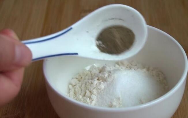 接下来调个稀油酥,碗里加入两勺面粉,适量的食盐,少一些的黑胡椒粉